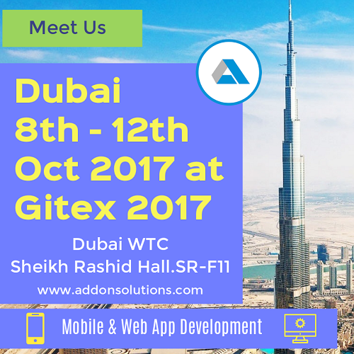 We Addon Solutions Pvt Ltd. is an Outsourcing Company providing Mobile Apps Development and Software Development Services in above technical fields and our team is ready to visit Gitex Technology Week 2017 with our stall at Dubai Word Trade Center, Shaikh Rashid Hall, FR-11 ESC pavilion from 8th Oct 2017 to 12th Oct 2017. Get in touch with our team for your app development or any custom software development requirements and do not miss free pass entry from us as stock is limited*